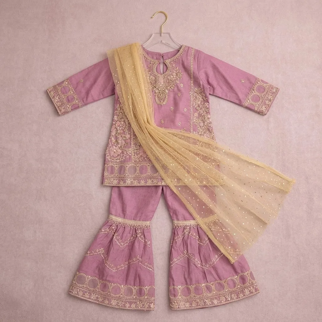 Step into the world of traditional opulence with our “Gul-e-Noor” Festive Collection. This mauve-hued Gharara suit is a masterpiece of Pakistani craftsmanship, blending a modern pastel palette with heritage embroidery techniques. Whether it’s an Eid brunch or a Mehndi night, this outfit offers a royal silhouette that is as comfortable as it is stunning.