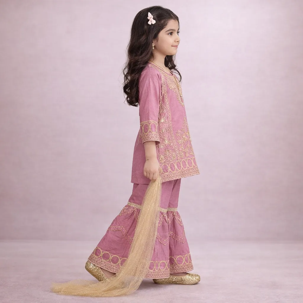 Fabric: Premium Cotton Silk (Kurti & Gharara), Soft Shimmer Net (Dupatta).